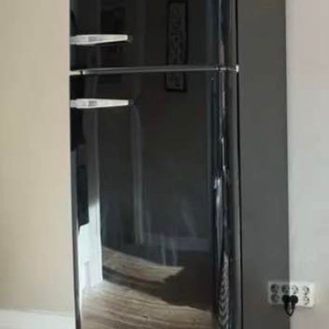 Smeg kylskåp i svart med rundad retrodesign. Invändigt finns flera trådhyllor och dörrfack med plats för flaskor och småsaker.