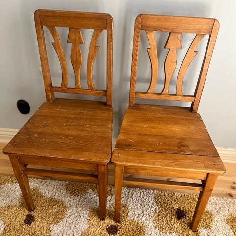 STOLAR, ett par, furu, "sportstugemöbel", genombruten rygg. Sannolikt Göran Malmvall. 1950/60-tal. Rygghöjd 80 cm. Slitage. Torksprickor. Stötmärken. Hämtas av köparen efter överenskommelse.