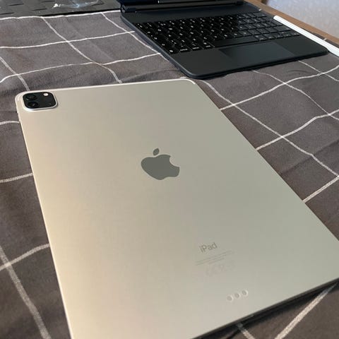Apple iPad Pro med 128 GB lagring i silverfärg. Stor skärm, dubbla kameror bak och laddas med USB‑C.