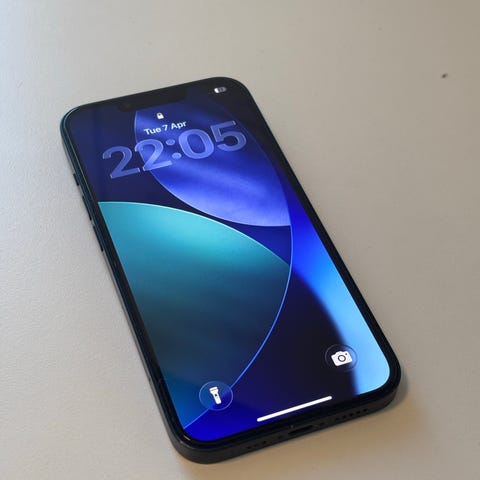 Säljer en iPhone 13 med 128 GB lagring i mörk blå färg.