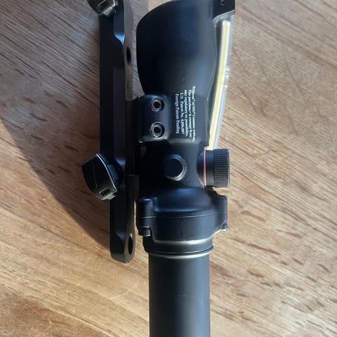 Trijicon ACOG TA24-2 kikarsikte i svart med fiberoptiskt sikte upptill. Har justerrattar och fäste för montering på skena.