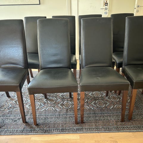 9 Matstolar från Jysk i mörkbrunt konstläder med höga ryggstöd. Stadiga ben i trä och lätt att torka av sits och rygg. Köptes till styrelserum lokal byttes efter några månader och stolarna behövdes inte längre. Därför försäljning