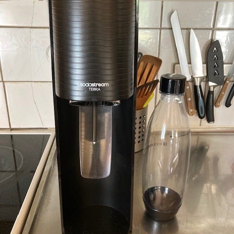 Sodastreamer plus 2 flaskor och en full gaspatron.