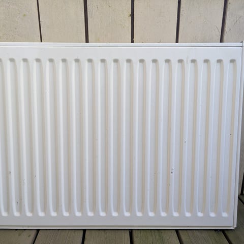 radiator i vitt med termostat . Har överdel för väggmontering , klassiska vertikala paneler.