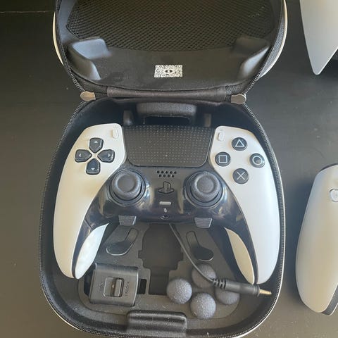 Lightning Backbone spelkontroll för mobil med vit/svart design och analoga spakar. Förvaras i ett hårt grått fodral med dragkedja.