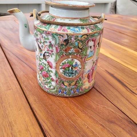 Unik form med skulpturala detaljer, kraftigt handtag och lock med figur. Dekorerad med kalligrafi och motiv i rustik glasyr. Passar perfekt som statement piece i asiatisk, bohemisk eller eklektisk inredning.