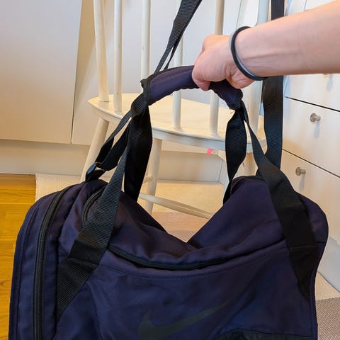 Svart gympapåse från Nike i tyg med stort vitt Swoosh-tryck på framsidan. Dragskostängning med snören som även funkar som axelremmar.