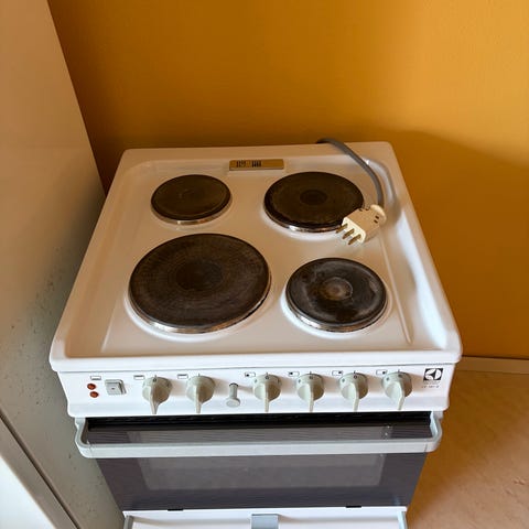 Skänker en spis med fyra plattor pga renovering. Ugnen är helt oanvänd med rena plåtar. Gott skick. Ser ganska ny ut.