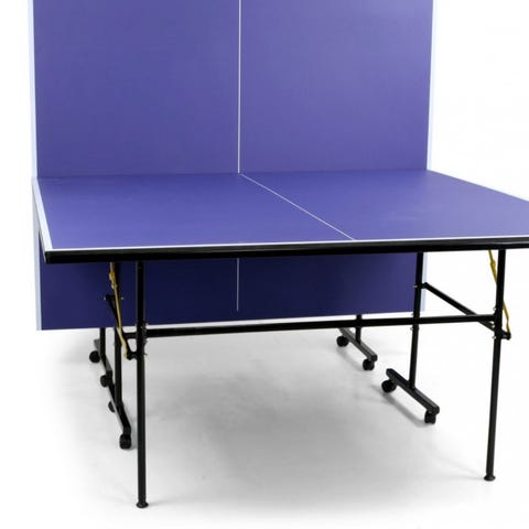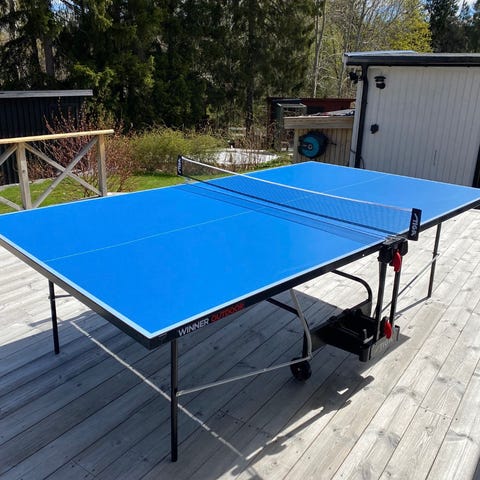Stiga Privat Roller pingisbord i blått med vit kantlist. Hopfällbart bord på hjul som är lätt att rulla undan när det inte används.