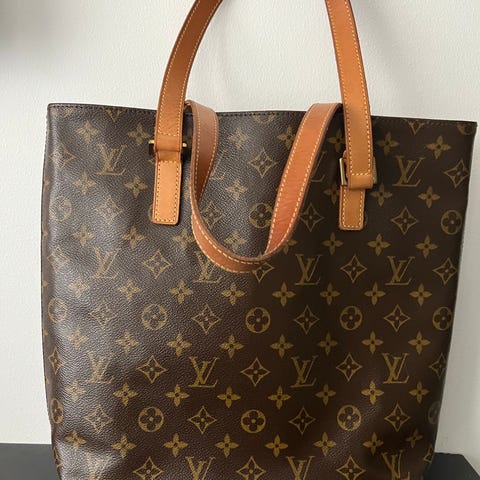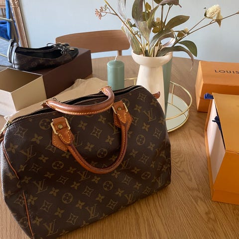 Louis Vuitton handväska i brunt rutigt mönster med läderhandtag. Dragkedja upptill och detaljer i guldtonad metall.