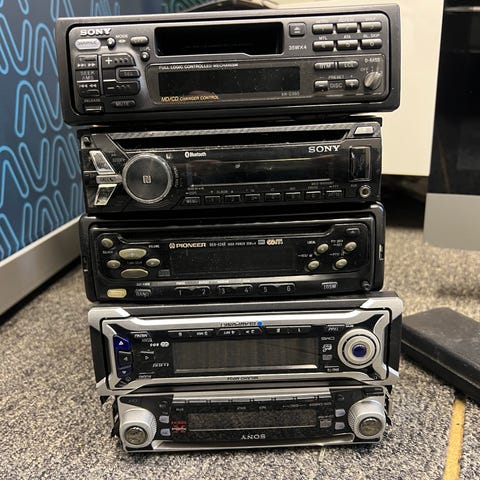 Professional Car Audio System bilstereo med hopfällbar front och AM/FM-radio. Medföljande fjärrkontroll, kablar och manual syns på bilderna.