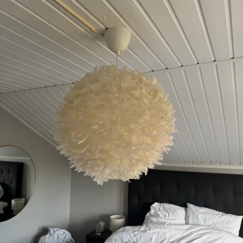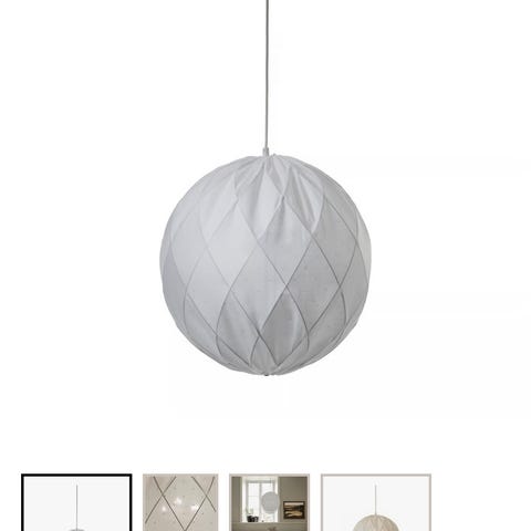 Takskärm av textil med struktur och riskonstruktion som ger ett vackert ljus. Skärmen har en invändig metallstomme. Forma metallstommen när du monterar skärmen så att den får en rund form.