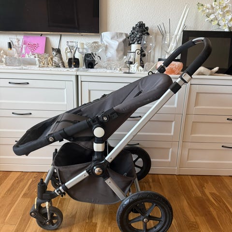 Bugaboo barnvagn i svart textil (solblekt) med sittdel (endast, från 6 månader) och justerbart handtag. Sittläge eller liggläge (platt, går att sova). Har fempunktssele, varukorg under vagnen och sufflett som går att fälla ner. Rätt sliten, men fungerar. Extravagn eller ”dagisvagn”?