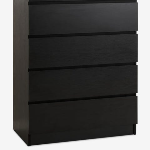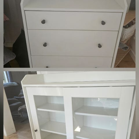 Vit byrå från IKEA, Aage Petersen, med tre lådor där översta har glasfront. Raka handtag och står på små ben, bra för förvaring i sovrum eller hall.