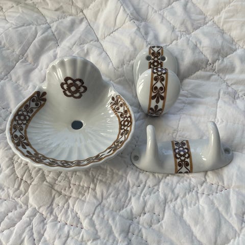 Fint badrumsset i vitt porslin från Porcelaine de Paris med brun blommig dekor. Innehåller tvålkopp och två krokar väggmonterade delar med hål för skruvar och skål med hål i botten för avrinning.