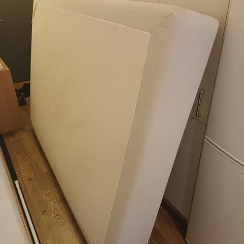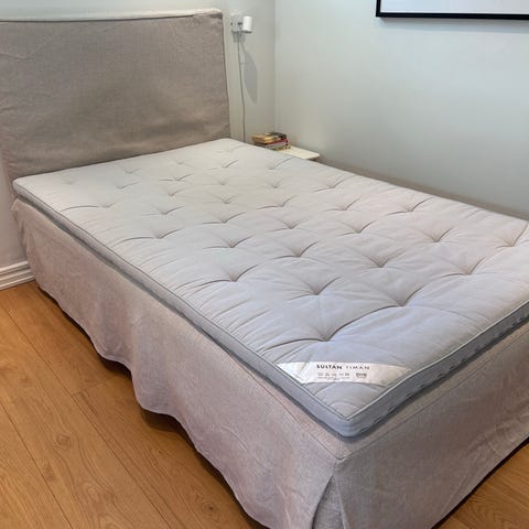 IKEA Sultan resårmadrass 90x200 i vitt tyg, med träben. Ingår grå huvudgavel. Även bäddmadrass om så önskas.