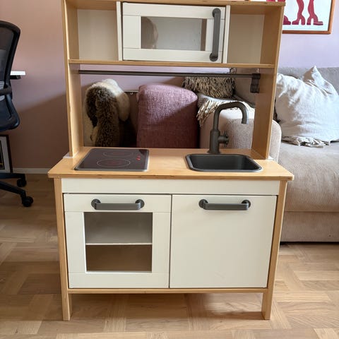 Leksakskök från IKEA med spisplattor, vask och två skåp under. Flera hyllor för leksaksmat och köksgrejer som syns på bilden.