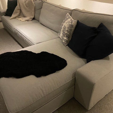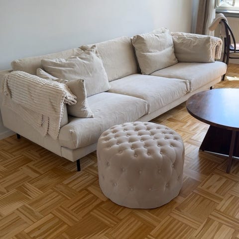 3 år gammal. Nypris 21000 kr för soffan och 900 kr för nackstöd.