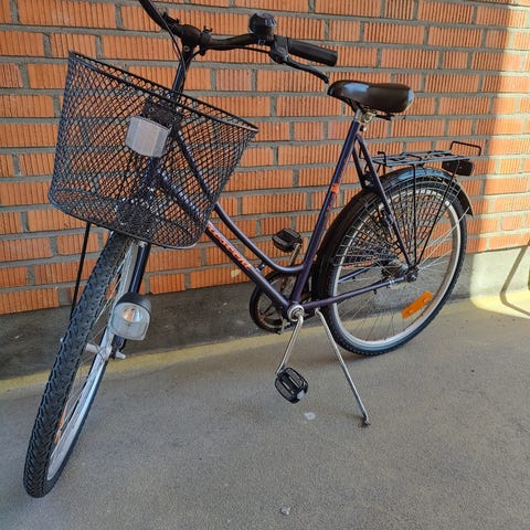 Cykeln är i bra skick och redo att användas direkt. Stabil och lättcyklad. Det ända som är lite tråkigt är att jag har råkat komma emot med silver färg på baken.