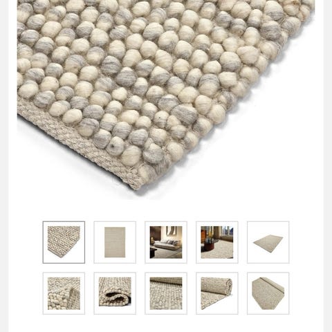 Vit/beige matta i 100% ull. Köpt för flera tusen för några år sedan, mattan har älskats men är nu redo för ett nytt hem. Den har några uppsprättade trådar och en del fläckar (se bilder), därav priset. Har dock ej provat att få bort fläckarna så med lite kemtvätt kan den säkert bli superfin!