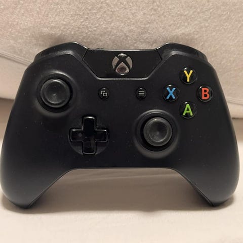 Vit trådlös Xbox Series handkontroll med svart styrkors och två analoga spakar. Vanliga Xbox-knappar upptill och batterilucka på baksidan.