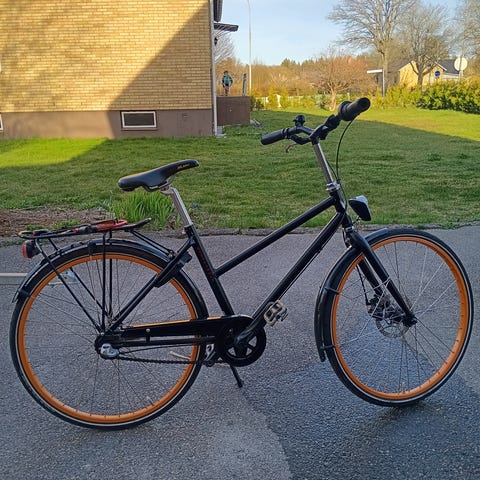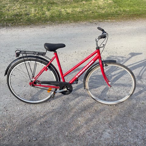 Monark stadscykel för herr med 28" hjul och ramstorlek L. Utrustad med pakethållare bak, kedjeskydd och handbroms med vridreglage på styret.