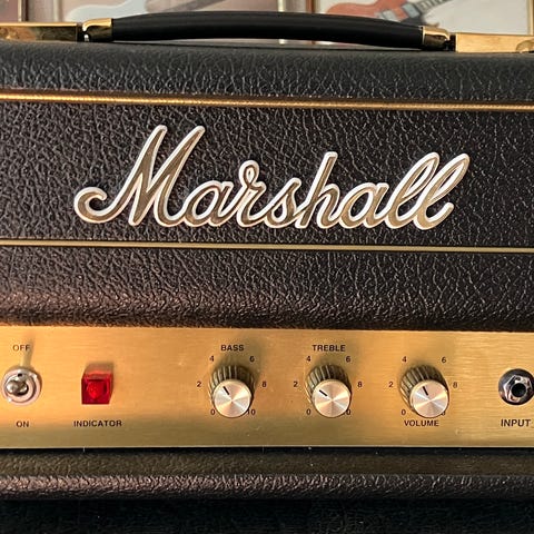 Marshall-topp, JTM1H, 1960s, rör-topp från 2012 när Marshall hade 50-års jubileum, 3 st rör, 1 watt, tillverkad i England 2012, mycket bra skick