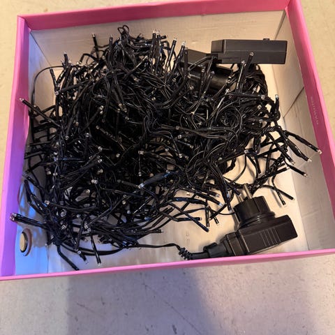 Dekorationsringar med LED-belysning från &Tradition, med svart kabel och vit ring. Drivs via USB-kabel med enkel kontroll på sladden.