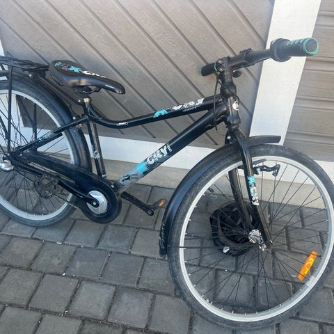 Crescent barncykel med 24" hjul i svart med röda detaljer. Utrustad med växlar, skärmar och kedjeskydd.
