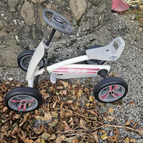 Rosa trampbil från Little People med metallkropp och stort runt ratt. Har nummerdekal på sidorna och sits i kontrastfärg som är lätt för barnet att kliva upp på.