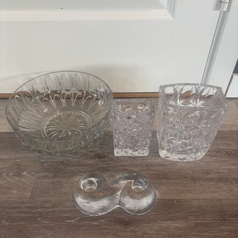 Vita glasbehållare från IKEA i olika storlekar, med marmorerat mönster i glaset. Fungerar bra som skålar eller krukor, säljes som set.
