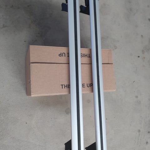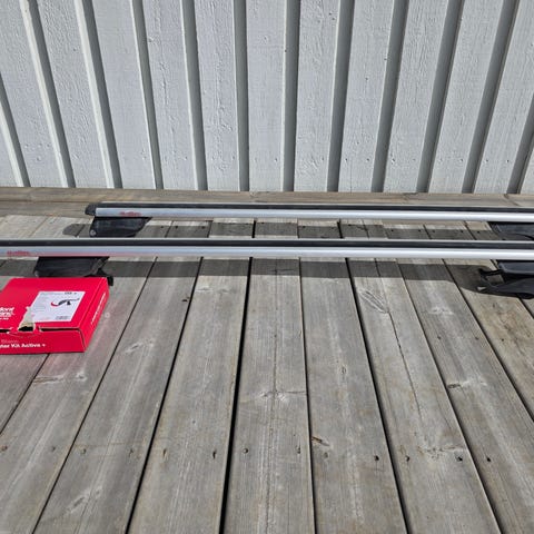 Takräcke från Skoda, transverse roof rack i silver med svarta fötter. Sitter på tvärs över taket och låses fast mot bilens takfästen. Två nycklar och en manual medföljer. Har suttit på Skoda Octavia combi årsmodell -22. Passar troligen många modeller.