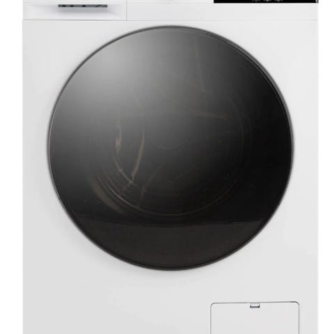 Cylinda frontmatad tvättmaskin i vitt med stor rund glaslucka. Enkel panel upptill med vred och knappar för program och inställningar. Cylinda FT4474A. Vet ej åldern då den fanns när vi flyttade in. Svarta prickar på gummibälgen som jag ej får bort. Bild lånad.