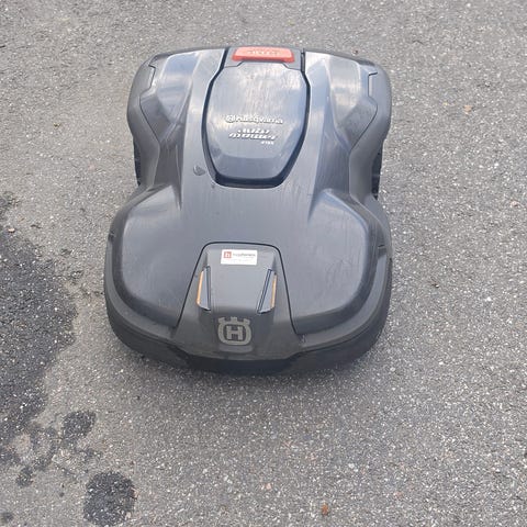 Husqvarna Automower robotgräsklippare säljes med kåpa och laddplatta. Flera delar syns på bilderna, bland annat roboten, skyddskåpa och basplatta.
