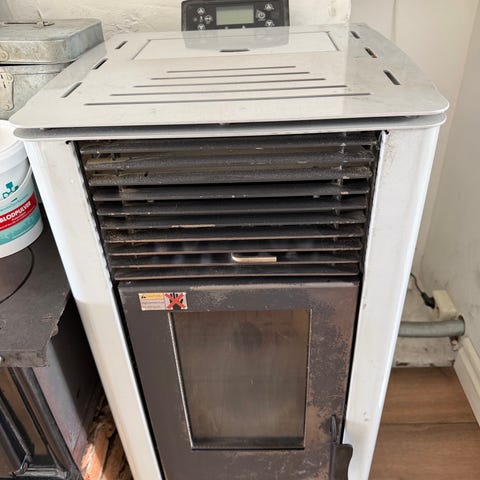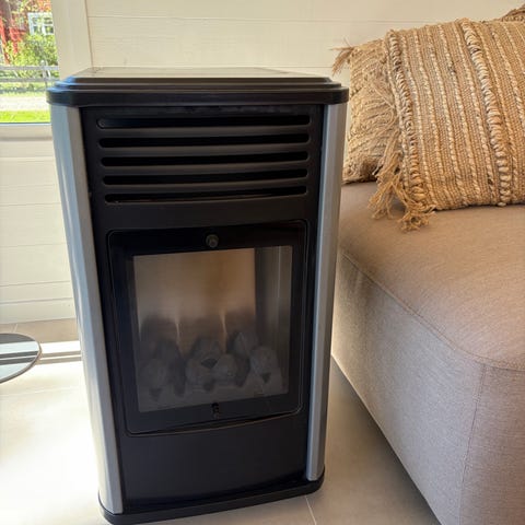 Zibro pelletskamin i svart med glasruta framtill. Har toppmatning för pellets och enkel panel med knappar upptill.