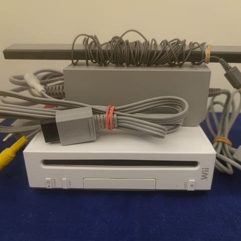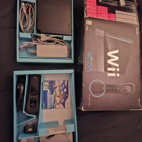 Nintendo Wii spelkonsol i svart med originalkartong. Följer med Wii Sports Resort på skiva + wii sport och flera tillbehör som syns på bilderna. Fungerar som den ska!
