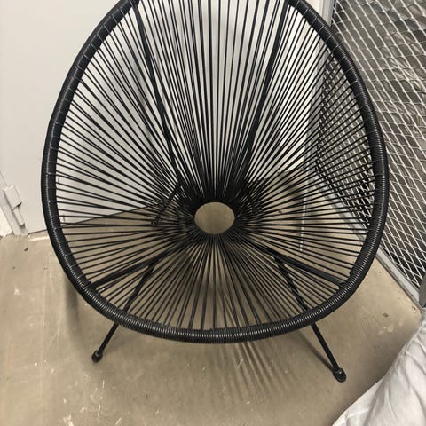 Grön rund loungestol med snörad sits och svarta metallben. Skön att ha på balkong eller uteplats.(2st 200kr)
