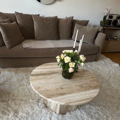 2st runda vardagsrumsbord i storleken 80cm och 55cm med glasskiva med marmormönster och guldben.