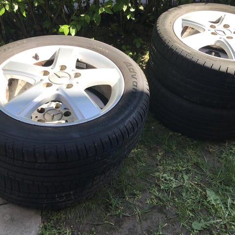 4st Mercedes fälger. Två med nästan nya däck och ett med typ 5 mm. Tyvärr är de sista däcket slut på grund av felaktig hjulinställning eller något. Har suttit på en Mercedes B200 CDI