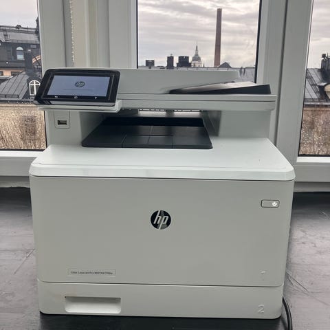 Oki Dia Copy multifunktionsskrivare i vit/svart med stor pekskärm och knappsats på sidan. Har flera pappersfack, dokumentmatare upptill och nätanslutning på baksidan.