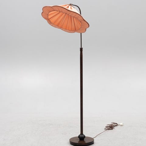 Fin golvlampa på tre ben. Den är justerbar i höjd och max-höjden är 150 cm inkl. lampskärmen. Trampkontakt på sladden. Benen är i trä med metalldetaljer. Ljuskälla ingår ej.