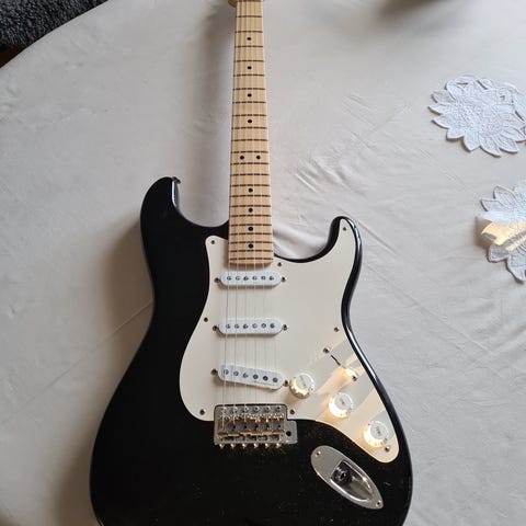 Svart squier strata med aluminium pickguard och tre singe-coil mickar i annorlunda uppsättning som ger tillgång till (enligt mig) super fräna ljud.