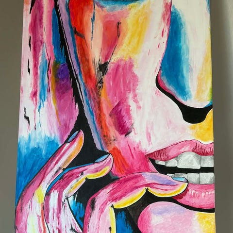 Stor abstrakt målning med kvinnoporträtt och mycket färg. Säljer tavlan som syns på bilderna, målad med breda penseldrag och tydlig signatur i hörnet.