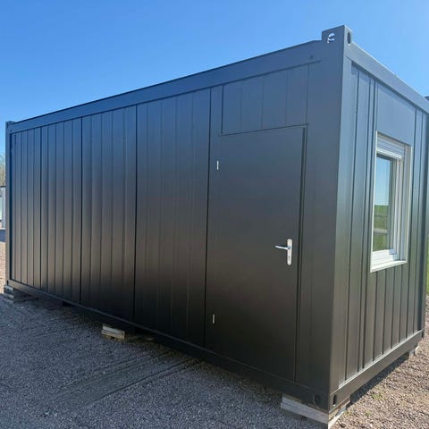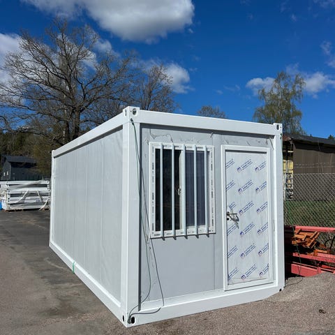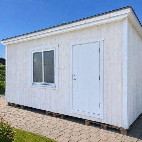 Grönt förråd/friggebod, vit dörr och ett litet fönster på sidan. Oisolerad. Träpanel med stående brädor och vit list runt kanter och tak.