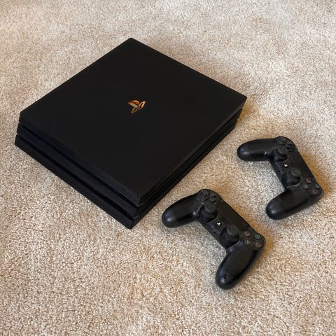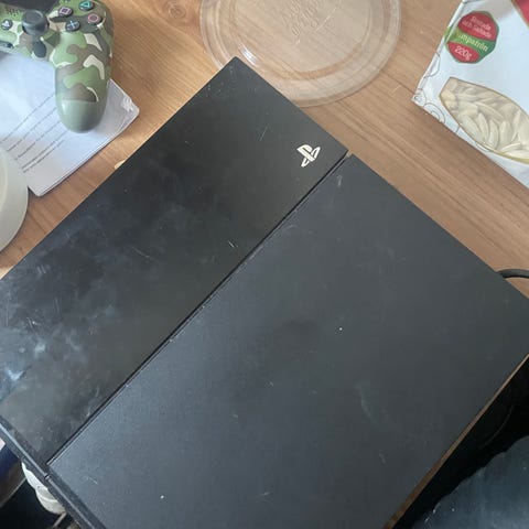 Sony Playstation 4 spelkonsol i svart. Enkel att koppla in med HDMI och har en handkontroll med kabel.