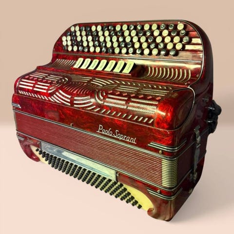 Fint rött dragspel från Paolo Soprani ,remmar dax att bytas i övrigt helt och spelbart.