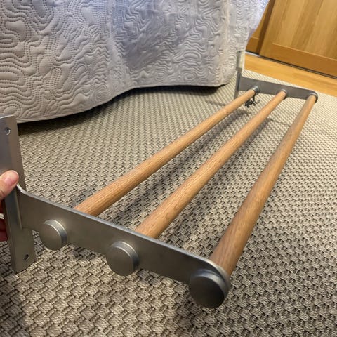 Hatt- och skohylla från essem design. Helvit. Använt skick. Köpt nytt och använt i ca 4 år. Stången man hänger galgar på har blivit lite sliten och på skohyllan har en ståltråd lossnat, inget jag tänkt på förrän nu när vi monterade ner det. Hämtas i Älta, kan även fraktas inom Stockholm enligt ök och liten avgift.