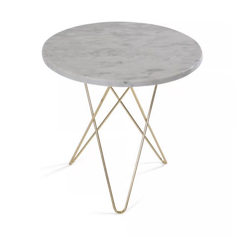 Vitt marmorbord med pelarfot i mässingsfärgad metall
