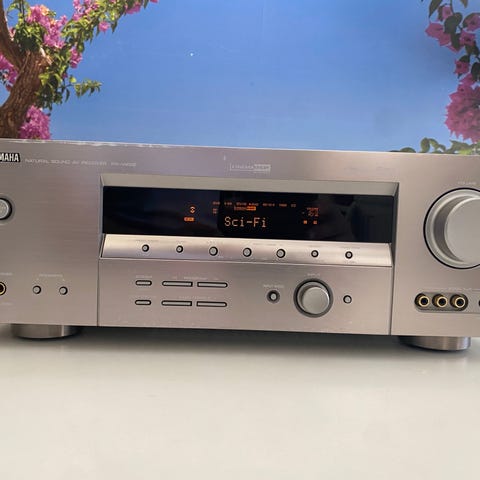 Andersson hemmabioreceiver med massor av in- och utgångar för högtalare och andra enheter. Stor volymratt fram och flera knappar för snabb styrning, fjärrkontroll syns också på bilden.