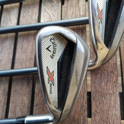 Callaway XR järnklubbor säljes som set, flera nummer i samma serie. Golf Pride-grepp och stålskaft med blå/vit design på skaften. 6- S. Dam järnsätt.